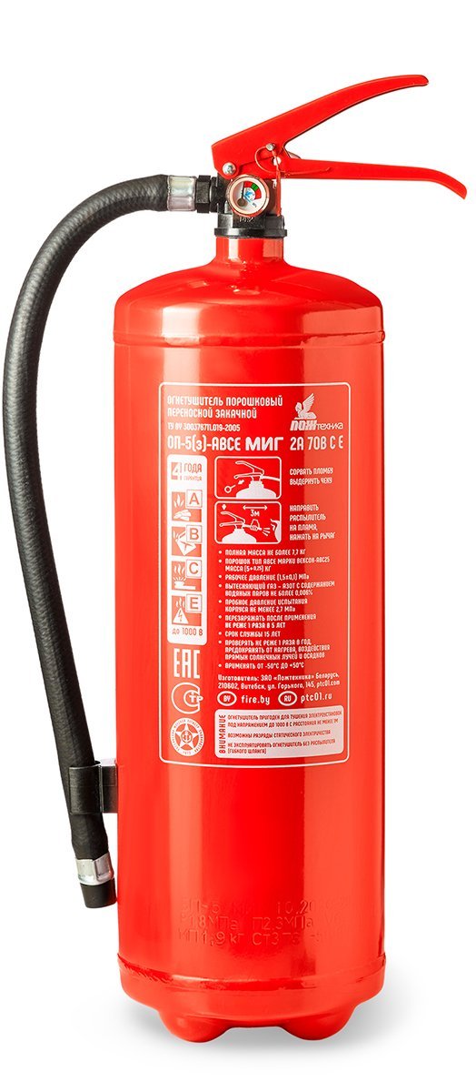 Огнетушитель предназначен для тушения пожаров классов:А – горение твердых веществ,В – горение жидких веществ,С – горение газообразных веществ,Е – горение электрооборудования, находящегося под высоким напряжением.