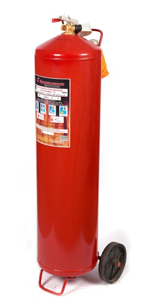 Огнетушитель порошковый закачной, передвижной. Огнетушитель порошковый закачной, вместимость корпуса 70,2 л, масса заряда порошка 70±3,5 кг, длина струи 6 м, продолжительность подачи 30 сек, огнетушащая способность 233В-2/10А, t-раб.-50…+50°С, длина шланга 3 м