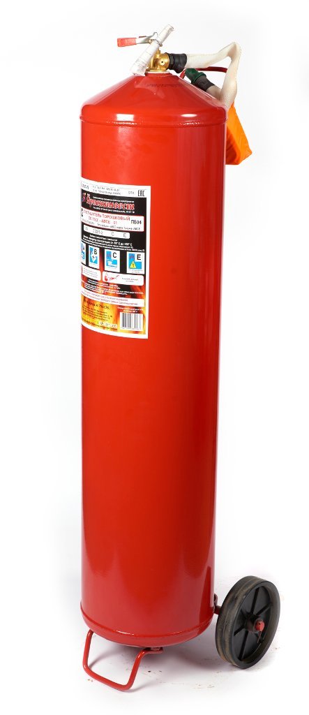 Огнетушитель порошковый, передвижной. Огнетушитель порошковый закачной, вместимость корпуса 94 л, масса заряда порошка 75 кг, длина струи 6 м, продолжительность подачи 30 сек, огнетушащая способность 10А, t-раб.-50…+50°С, длина шланга 3 м