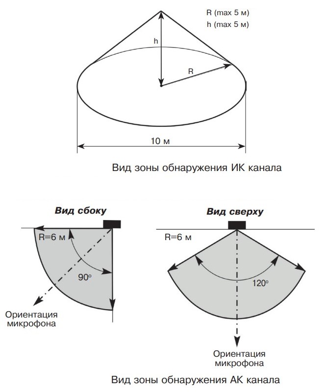 - устанавливается на потолке помещения; - зона обнаружения ИК-канала: объемная с высокой плотностью заполнения, обеспечивающая высокую вероятность обнаружения при движении со всех направлений;- наличие экрана защиты пироприемника от насекомых;- защита от несанкционированного вскрытия корпуса;- микропроцессорная обработка сигнала;- световая индикация состояния каналов обнаружения и возможность ее отключения;- выбор режимов чувствительности АК и высоты установки ИК каналов;- контроль напряжения питания;- температурная компенсация обнаруживающей способности при изменении температуры окружающей среды;- раздельные выходы на ШС по АК и ИК каналам;- отдельное реле неисправности/вскрытия;- извещатель выдает тревожное извещение размыканием шлейфов сигнализации контактами исполнительных реле отдельно по АК и ИК каналам.