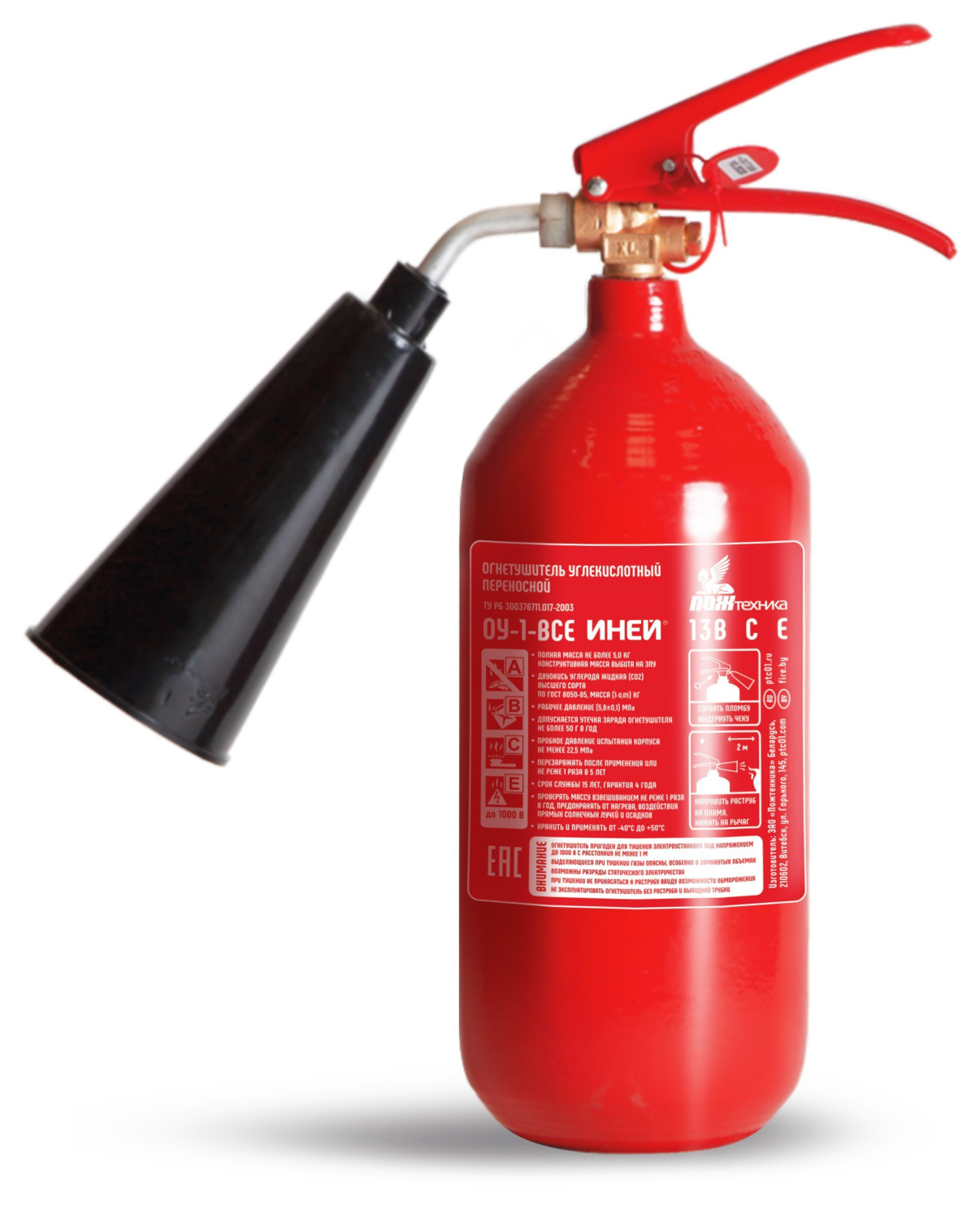 Углекислотные огнетушители (ОУ) «ИНЕЙ» применяются для тушения пожаров классов В, С, Е и наиболее эффективны для тушения электроустановок, находящихся под напряжением, поскольку практически не наносят ущерб защищаемому имуществу, так как углекислота, находящаяся в качестве заряда внутри углекислотного огнетушителя в сжиженном виде, превращается после выброса из огнетушителя в «сухой газ», который не загрязняет защищаемое имущество.