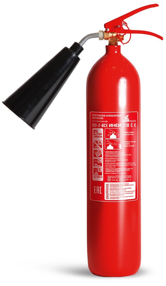 Углекислотные огнетушители (ОУ) «ИНЕЙ» применяются для тушения пожаров классов В, С, Е и наиболее эффективны для тушения электроустановок, находящихся под напряжением, поскольку практически не наносят ущерб защищаемому имуществу, так как углекислота, находящаяся в качестве заряда внутри углекислотного огнетушителя в сжиженном виде, превращается после выброса из огнетушителя в «сухой газ», который не загрязняет защищаемое имущество.