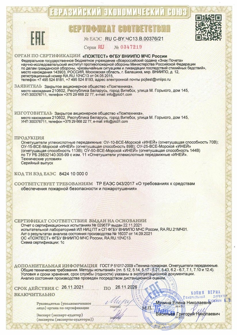 Передвижные углекислотные огнетушители ИНЕЙ обладают повышенной огнетушащей способностью и производятся в специальном климатическом исполнении «Морской» для применения на морских судах и объектах портовой инфраструктуры.Температура эксплуатации углекислотных огнетушителей (ОУ) ИНЕЙ: от -40ºС до +50 ºС.