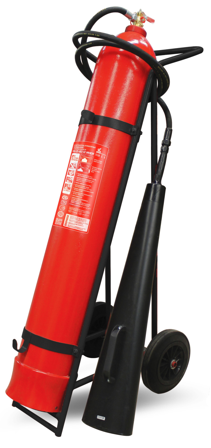 Огнетушитель углекислотный, передвижной. Огнетушитель углекислотный передвижной (1 баллон на тележке), огнетушащая способность 113В, С, Е; масса огнетушащего вещества 25-1.25 кг, продолжительность подачи ОТВ 15 сек, t-раб.-40…+50°С, габ.размеры (высота, ширина по длине шасси) 1500х480 мм, 110 кг