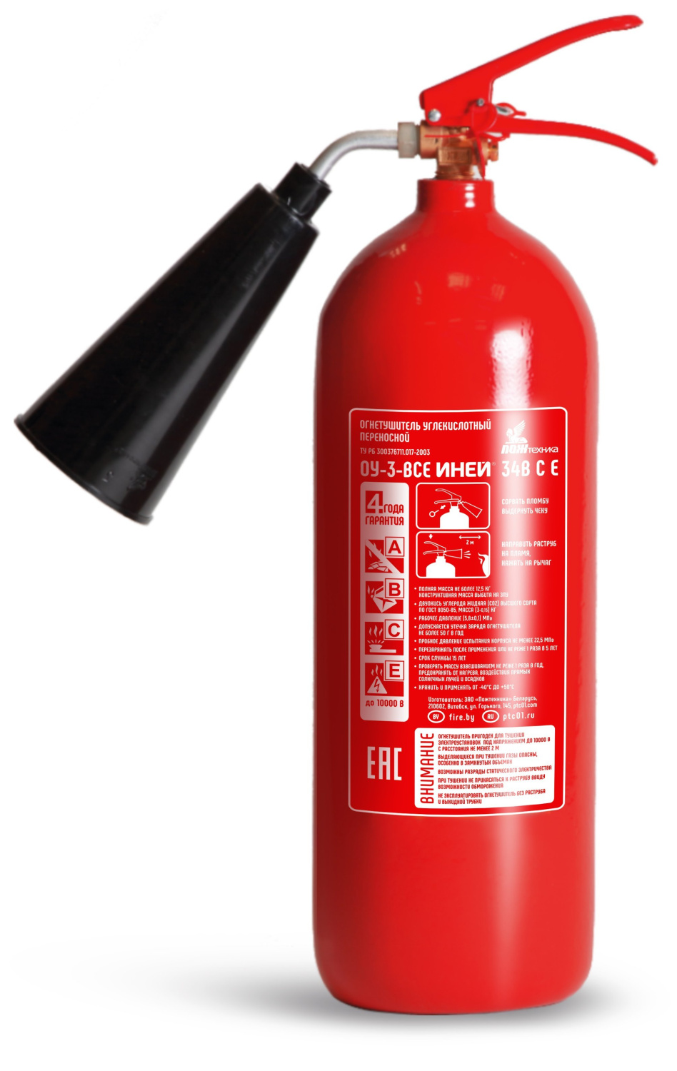 Углекислотные огнетушители (ОУ) «ИНЕЙ» применяются для тушения пожаров классов В, С, Е и наиболее эффективны для тушения электроустановок, находящихся под напряжением, поскольку практически не наносят ущерб защищаемому имуществу, так как углекислота, находящаяся в качестве заряда внутри углекислотного огнетушителя в сжиженном виде, превращается после выброса из огнетушителя в «сухой газ», который не загрязняет защищаемое имущество.