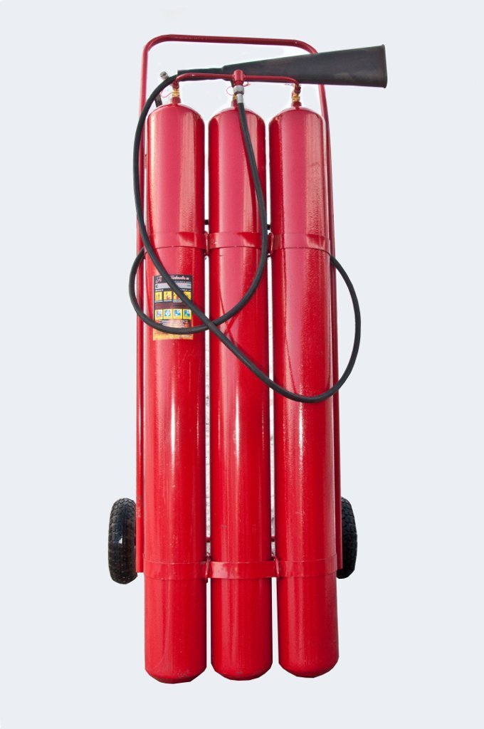 Огнетушитель углекислотный, передвижной. Огнетушитель углекислотный передвижной, вместимость корпуса не менее 3х17.87 л, масса заряда не менее 40 кг, длина струи 4 м, огнетушащая способность 89В, продолжительность подачи не более 210 сек, диапазон рабочих температур -40…+50°С, в комплекте два шланга с раструбом и один смеситель