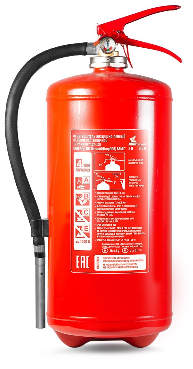 Огнетушитель закачной воздушно-пенный летний. Огнетушитель воздушно-пенный, огнетушащая способность 1А, 55В, масса огнетушащего вещества 4 кг, объем баллона 5 л, продолжительность подачи ОТВ 20 сек, t_раб.+5…+50°С, 450х150 мм, 6.6 кг
