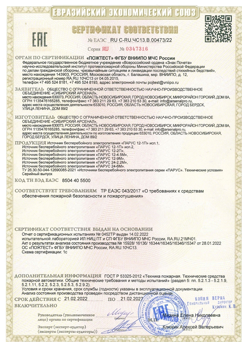 "Парус 24-2,2М (Парус-7М) " предназначен для обеспечения бесперебойного электропитания устройств охранно-пожарной сигнализации, камер видеонаблюдения, электромеханических замков и других потребителей при номинальном напряжении 24 В постоянного тока.
