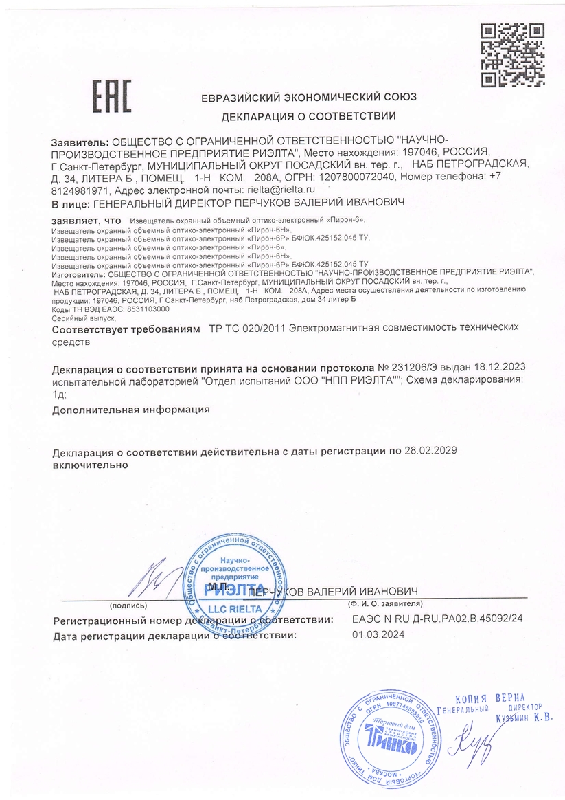 Извещатель охранный объемный оптико-электронный "Пирон-6" предназначен для обнаружения проникновения в охраняемое помещение и выдачи извещения о тревоге путем размыкания контактов реле.