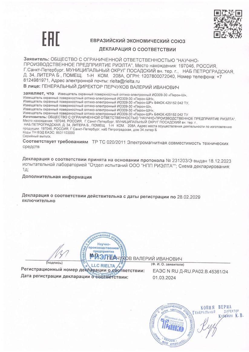 - микропроцессорная обработка сигнала;- устойчив к засветке более 6500 лк;- основание корпуса имеет четыре плоскости для крепления. Это обеспечивает возможность установки извещателя без кронштейна на стену, потолок и в угол, так и непосредственно в проеме (в углах оконных рам, дверных коробок и т. п.);- извещатель выдает тревожное извещение размыканием шлейфа сигнализации контактами исполнительного реле.
