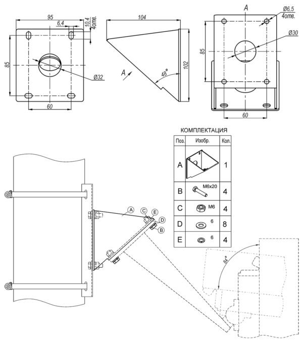Переходник кронштейна. Переходник кронштейна ПК-100 исп.48 предназначен для крепления кронштейнов типа КТ, КТУ, КТУН и позволяет увеличить угол наклона видеокамеры до 90°, 104х95х102 мм.