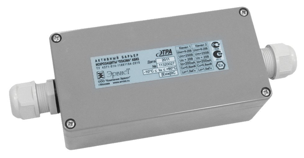 Активный барьер искрозащиты «Плазма» АБИЗ представляет собой единый неразборный блок, залитый компаундом и помещенный в пластмассовый корпус. При попадании высокого напряжения в искробезопасные цепи (идущие от ПКП или ИЭ к барьеру) барьер обеспечивает перегорание встроенного предохранителя и тем самым отключает защитную цепь от опасного напряжения. Защита от превышения тока в искрозащитной цепи обеспечивается утроением ячейки активной токовой защиты.