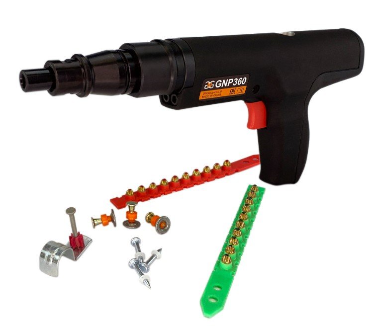 Полуавтоматический монтажный пистолет (1 гвоздь заряжается в ствол - 10 патронов в кассете + ручная полуавтоматическая перезарядка). Широкий диапазон выполняемых монтажных работ.Надежная конструкция, минимальная сила отдачи, низкий уровень шума и малый вес инструмента.6 уровней регулировки силы выстрела с быстрым переключением режимов делают монтажный пистолет GNP360 очень удобным в использовании.Профессиональный инструмент для интенсивной работы.Пороховой монтажный пистолет GNP360 имеет широкую область применения, прост в эксплуатации и обслуживании, безопасен и не требует специальных навыков. Применяется для монтажа на различных типах поверхностях, таких как: бетон, металл, стеновые блоки, кирпич. Является эффективным инструментом при фиксации опалубки, штукатурной сетки, профлиста и гидроизоляционных материалов. Существенно повышает производительность. Мощный и эргономичный пороховой монтажный пистолет.