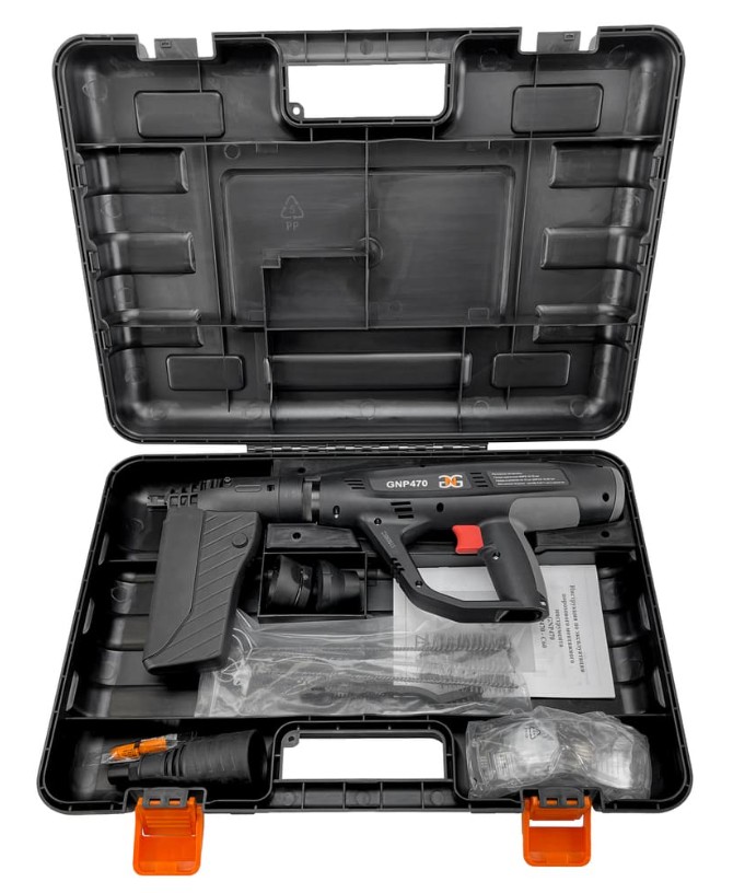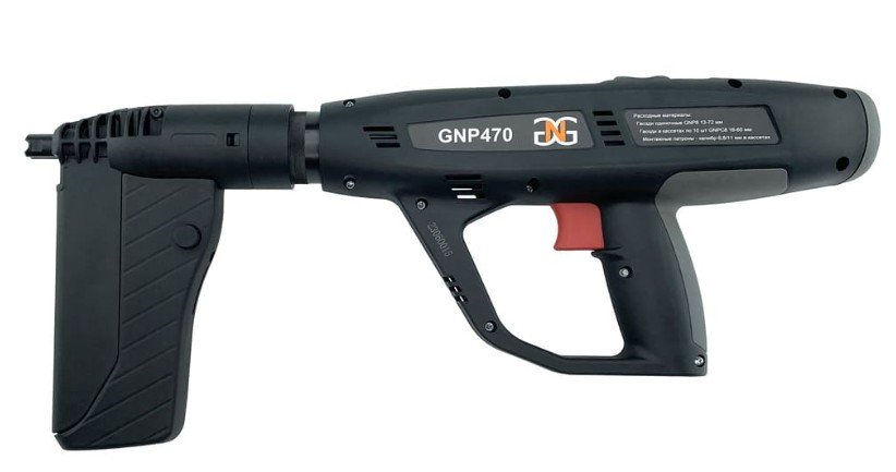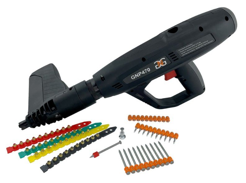 Полностью автоматический монтажный пистолет (10 гвоздей - 10 патронов + автоматическая перезарядка). Широкий диапазон выполняемых монтажных работ.Пороховой монтажный пистолет GNP470 имеет широкую область применения, прост в эксплуатации и обслуживании, безопасен и не требует специальных навыков. Применяется для монтажа на различных типах поверхностях, таких как: бетон, металл, стеновые блоки, кирпич. Является эффективным инструментом при фиксации опалубки, штукатурной сетки, профлиста и гидроизоляционных материалов. Существенно повышает производительность, позволяя забивать до 500 гвоздей в час. Мощный и эргономичный пороховой монтажный пистолет.