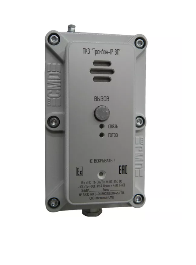 IP вызывная панель. Абонентское переговорное устройство Системы Обратной Речевой Связи, для совместной работы с пультами «Тромбон IP-ПЗВ» и ПО «Тромбон IP-ПО» в системах СОУЭ 4-го и 5-го типов. АУ предназначено для взрывоопасных зон классов "1" и "2". Встроенный динамик мощностью 5Вт; индикация режимов: «Готов» и «Связь»; интерфейс: Ethernet/PoE; 48В (PoE af); 17,5 Вт; IP66; -60...+60°C; габаритные размеры: 333х146х100 мм. Корпус АУ из алюминиевого сплава с присоединенной к нему коммутационной коробкой для НАКЛАДНОГО монтажа.