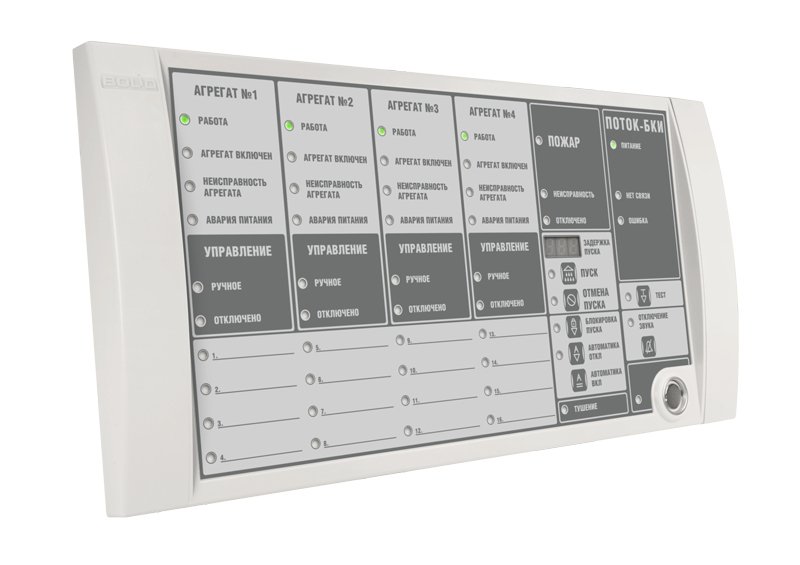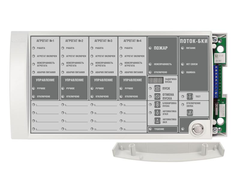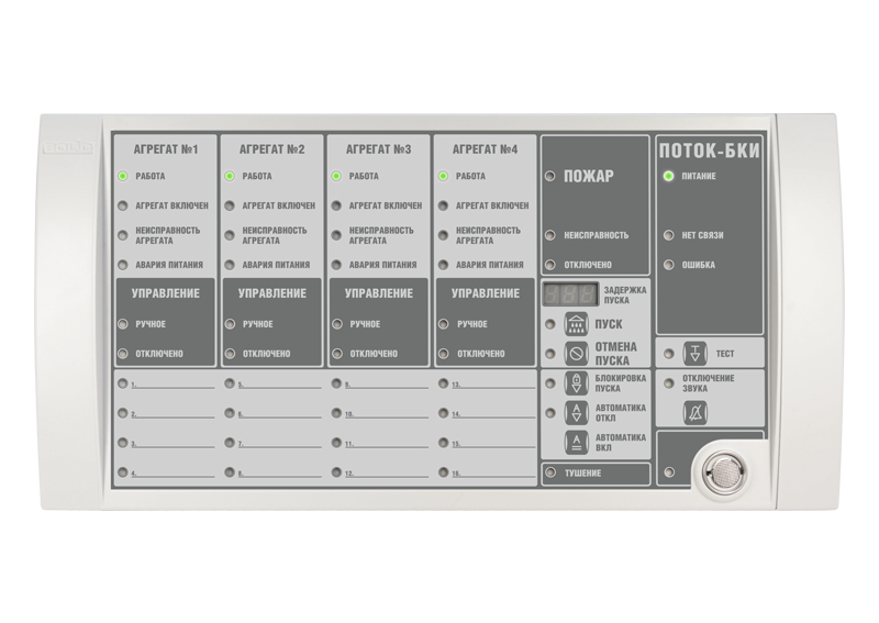 Блок индикации и управления. Блок управления и индикации состояния прибора Поток-3Н; 24 индикатора состояния 4 пожарных агрегатов; 14 индикаторов состояния блока «Поток-3Н» и блока «Поток-БКИ»; 1 семисегментный индикатор задержки пуска; 16 индикаторов состояния пожарных и технологических разделов; два интерфейса RS-485; два входа питания, Uпит.10.2...28.4 В, Iпотр.200 мА; IP20, t-раб.-30...+50°С, 340х170х27 мм