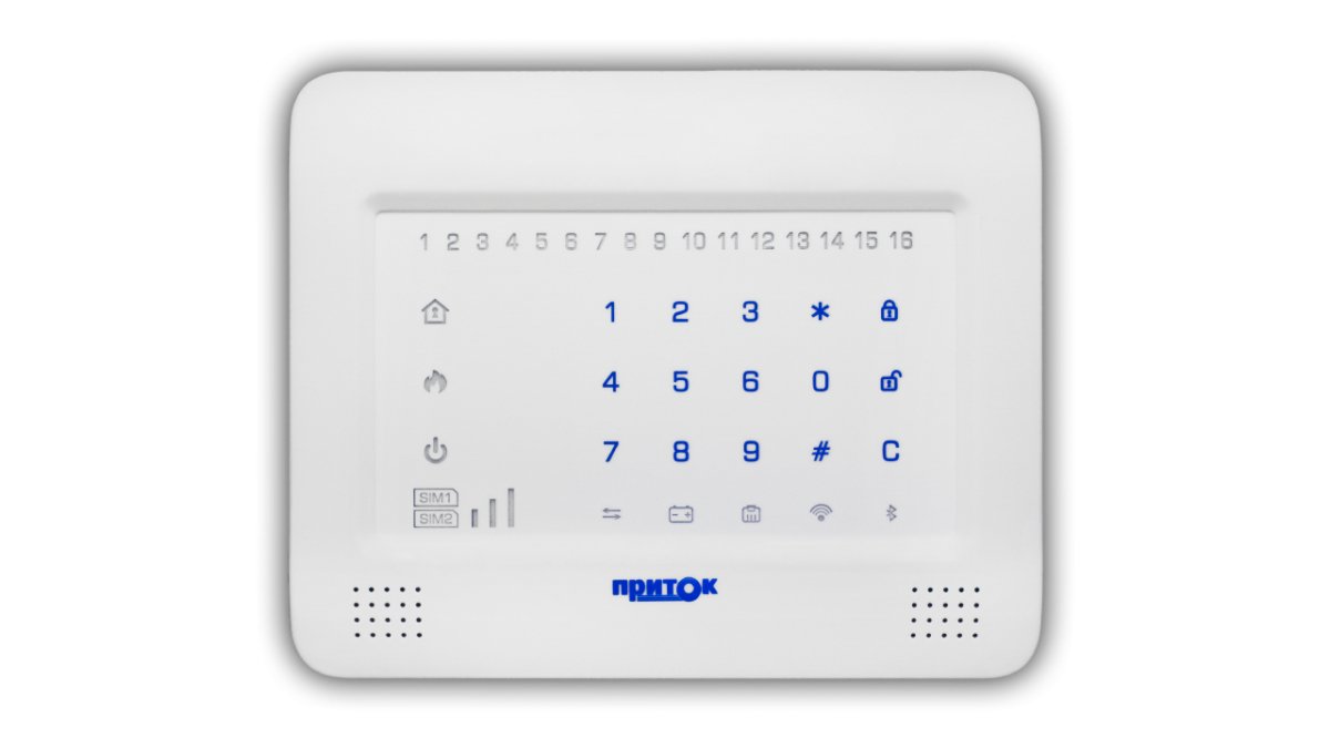 Сенсорная клавиатура. Сенсорная клавиатура для работы с приборами Приток-А-КОП на 16 ШС; встроенный считыватель NFC; до 64 идентификаторов записываемых в клавиатуру, RS-485, TouchMemory, miniUSB; U-пит.10.2...14.5 В, I-потр.150 мА; t-раб.-10...+50°С, 197х162х38 мм