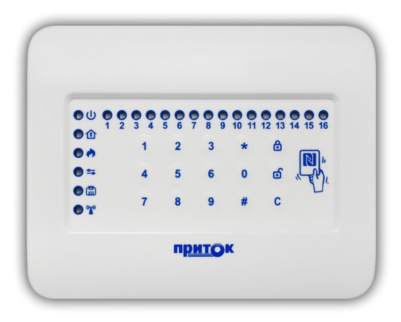 Клавиатура. Мембранная клавиатура для работы с приборами Приток-А-КОП на 16 ШС; встроенный считыватель NFC; RS-485, два порта TouchMemory; U-пит.10.2...14.5 В, I-потр.200 мА; t-раб.-10...+45°С, 160х128х32 мм