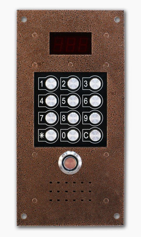 Блок вызова домофона. Многоабонентский аудио блок вызова с цифровой адресацией, до 255 абонентов (999 при работе с БКЗ-3А). Вводимые номера: от 1 до 999. Работа с идентификаторами DS1990A, функции *АНТИКЛОН* и *АВТОСБОР*, память ключей: 2044 (4092 или 8188 при замене микросхемы памяти). Постоянная светодиодная подсветка клавиатуры. Встроенная плата снятия остаточной намагниченности. U-пит.пост. 15 В, I-потр. 0,3 А (без учёта эл.магн. замка). t-раб. -30…+40°С, габ.размеры 220х110х32 мм. Цвет корпуса: медный антик (порошковое покрытие).