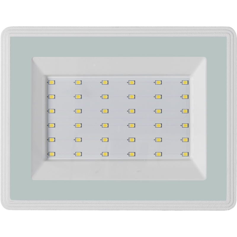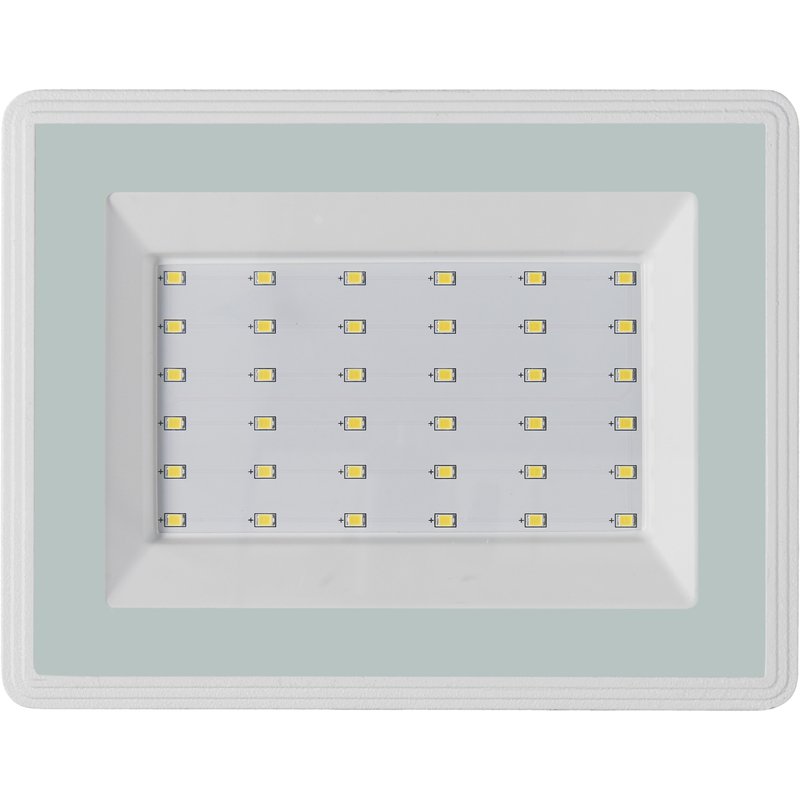 Прожектор светодиодный. Прожектор светодиодный 50 Вт; световой поток 5000 лм. Цветовая температура 6500 К; угол светового пучка 120°, U-пит. 220…240 В; IP65, t-раб.-45…+50°C, 168х152х23 мм. Цвет белый. Алюминиевый корпус.
