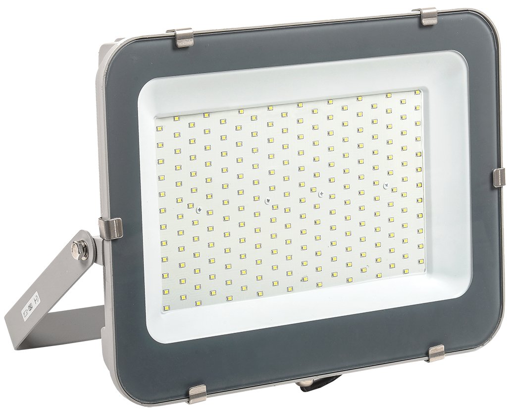 Прожектор светодиодный. Прожектор светодиодный 200 Вт, световой поток 17000 лм; цветовая температура 6500 К; угол светового пучка 120°, U-пит. 180…240 В/50(60) Гц, IP65, t-раб. -40…+50°С, габ.размеры 382х296х53 мм, алюминиевый корпус, серый.