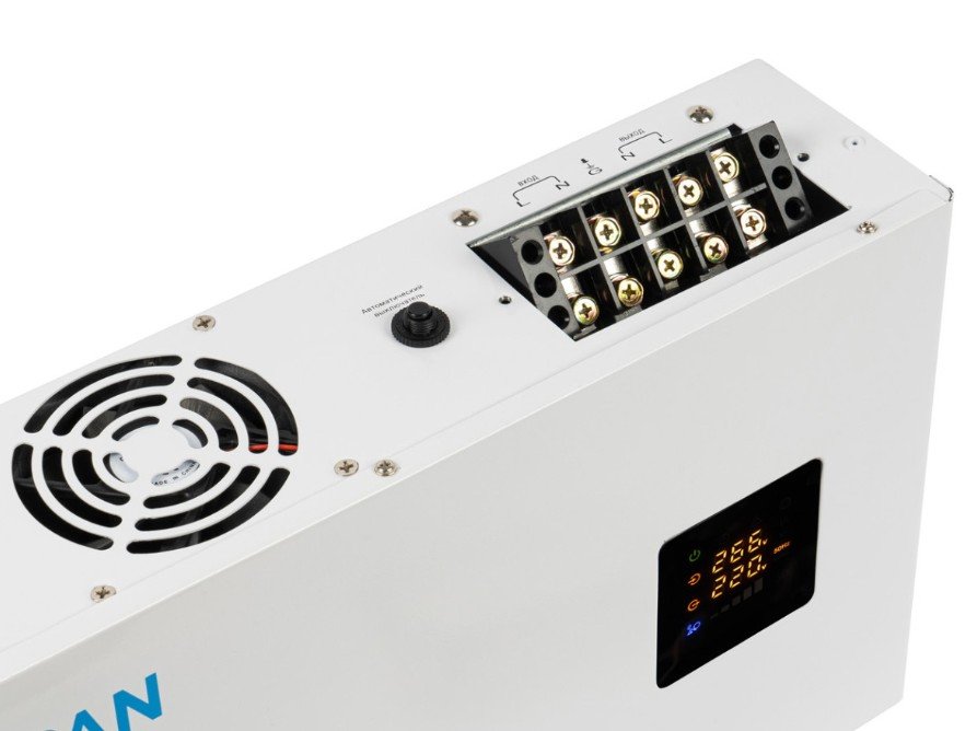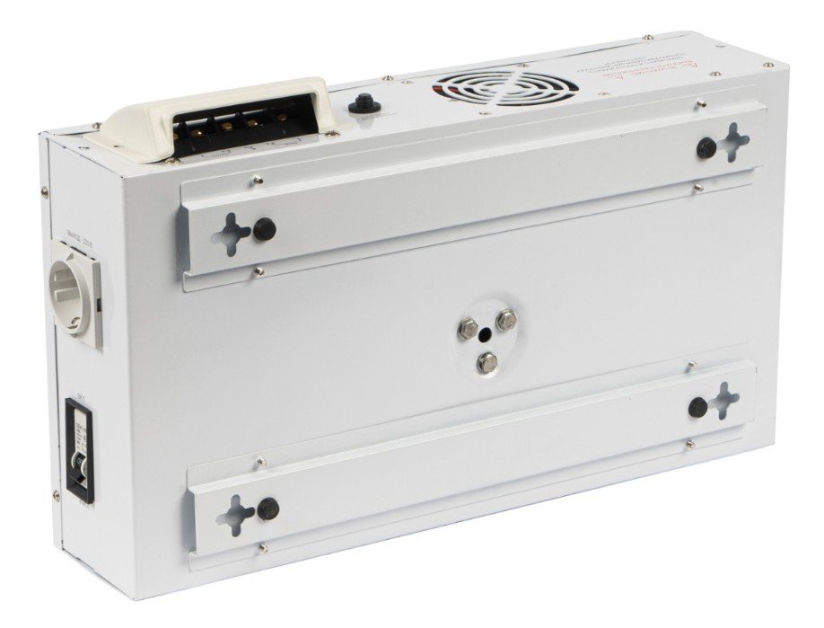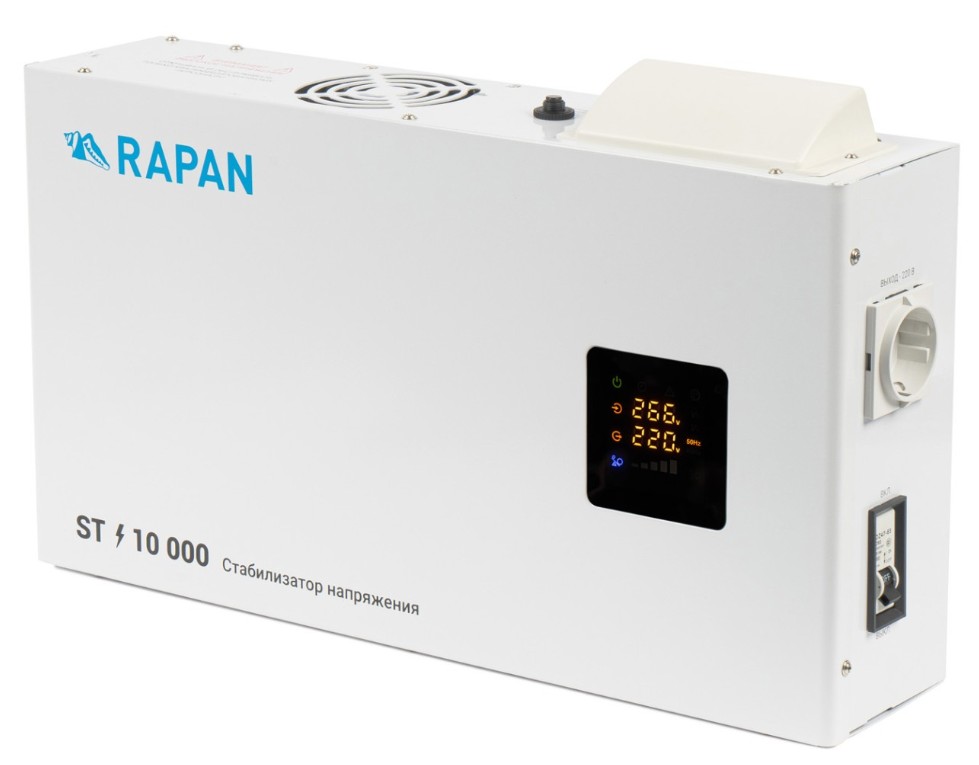 Стабилизатор напряжения. Стабилизатор напряжения; U-вх.100...260 В, U-вых.202...237 В, Р-нагр.10000 ВА; форма выходного напряжения - чистая синусоида; защита от перегрева, встроенный вентилятор, защитное отключение при аварийно низком/высоком напряжении с автоматическим восстановлением; цифровой дисплей; IP20, t-раб.-10...+40°C, габ.размеры 452х247х103 мм, вес 13 кг
