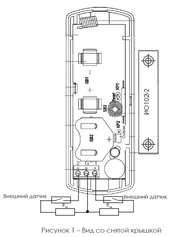 Датчик открытия (две зоны). Радиоканальный датчик открытия для работы в составе системы RiDom; f-раб. 868,7…869,2 МГц, Р-изл. ≤25 мВт; расстояние между датчиком и магнитом: "Норма" - ≤5 мм, "Тревога" ≥15 мм, 2 ШС для подключения внешних СМК, встроенный геркон и линия G1 объединены в одну зону контроля, тактика работы которой задается перемычкой; элементы питания CR123А 1 шт. и CR2450 1 шт. (в комплекте); IP30, t-раб. -20…+55°C, габ.размеры 112х41х32 м мм.