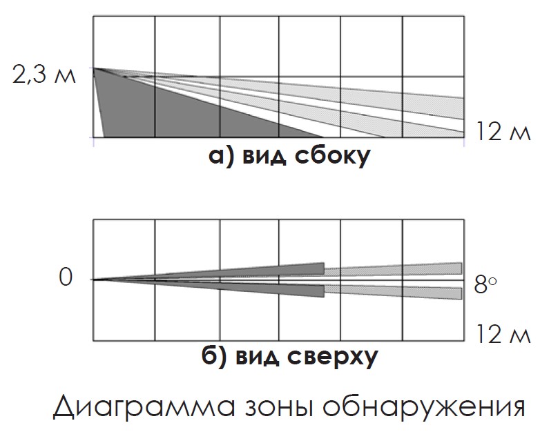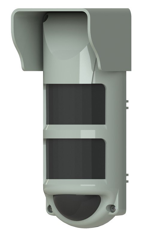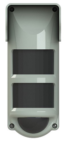 Датчик движения уличный (линза штора). Уличный радиоканальный датчик движения для работы в составе системы RiDom; f-раб. 868,7…869,2 МГц, Р-изл. ≤25 мВт, с защитой от животных весом до 20 кг, 3 пироприемника, линза "штора", зона обнаружения 12м х 8°, встроенный датчик измерения Т°C с погрешностью ±2.0°C, питание от двух элементов CR123А (в комплекте); IP54, t-раб. -40…+55°C, габ.размеры 180х75х80 мм. Поворотный кронштейн в комплекте