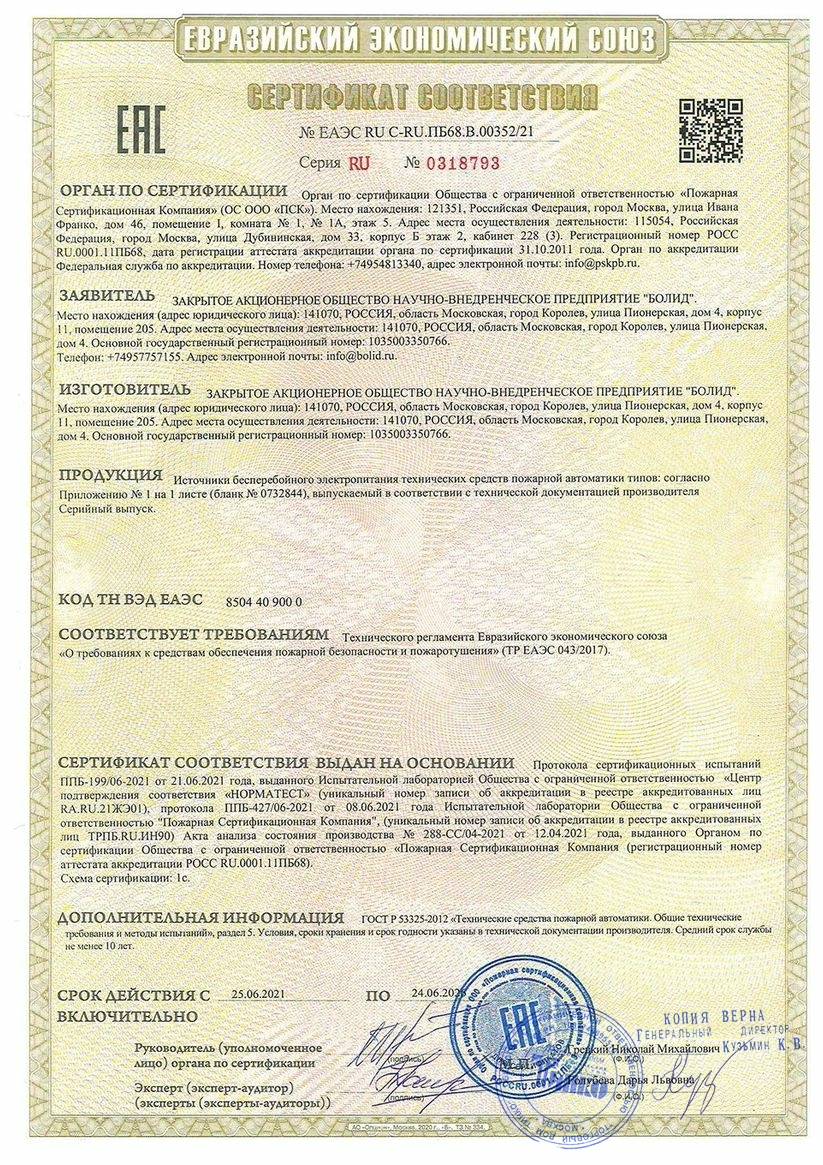 * - Передача событий на пульт "С2000М" или АРМ "Орион Про":- "Авария сети" (сетевое напряжение питания ниже 150 В или выше 250 В)- "Перегрузка источника питания" (выходной ток РИП более 2,5 А)- "Неисправность ЗУ" (ЗУ не обеспечивает напряжение и ток для заряда батарей (АБ) в заданных пределах)- "Неисправность источника питания" (при выходном напряжении ниже 20 В или выше 28,5 В)- "Неисправность батарей" (напряжение (АБ) ниже нормы, либо их внутреннее сопротивление выше предельно допустимого)- "Тревога взлома" (корпус РИП открыт)- "Отключение выходного напряжения"* - Измерение и передача данных по запросу от "С2000М" или АРМ "Орион Про":- напряжения в сети- напряжения на АБ- напряжения на выходе- тока нагрузки* - Расширенный диапазон входного напряжения сети* - Защита с автоматическим восстановлением работоспособности от:- превышения выходного напряжения- перегрузок по выходу- "переполюсовки" АБ- замыкания клемм подключения АБ* - Интеллектуальный контроль аккумуляторных батарей и управление зарядом:- автоматическая проверка состояния АБ тестовой нагрузкой- измерение емкости АБ- расчет времени работы в резервном режиме с учетом реального тока нагрузки- программируемый таймер-счетчик времени наработки АБ- отключение АБ при их разряде и превышении допустимого напряжения- автоматическая регулировка напряжения заряда АБ в зависимости от температуры внутри корпуса- контроль тока и напряжения зарядного устройства (ЗУ)* - Световая индикация и звуковая сигнализация:- наличие сетевого напряжения в сети- выход сетевого напряжения за пределы нормы (менее 150 В или более 250 В)- наличие или нарушение связи по интерфейсу RS-485- короткое замыкание или перегрузка по выходу- заряд АБ- отключение АБ при разряде- неисправность ЗУ- отключение выхода РИП в аварийных ситуациях* - Энергонезависимый буфер событий* - Релейный выход для сигнала "Неисправность"* - Конфигурирование параметров РИП: изменение сетевого адреса, времени задержек передачи событий, времени управления реле с помощью программы UPROG