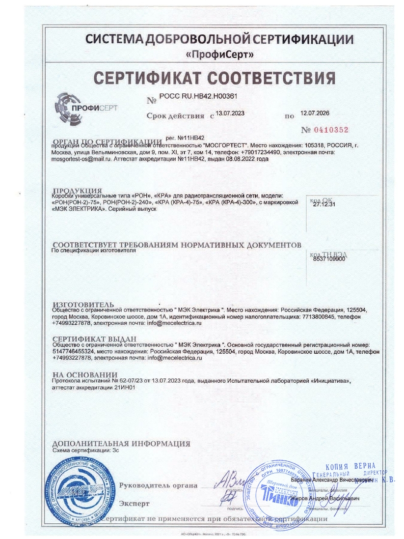 Коробка радиотрансляционная абонентская РОН применяется в сетях радиофикации. В радиосетях г. Москвы используются РОН 75 Ом, на остальной территории РФ - РОН 240 Ом. Коробка устанавливается на магистральном или другом направлении абонентской линии с возможностью подключения двух отдельных направлений радиотрансляционной сети внутридомовых проводов. Коробка РОН является одновременно и ограничительной и ответвительной.