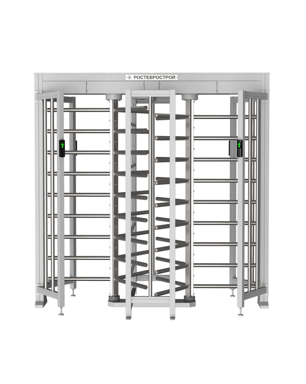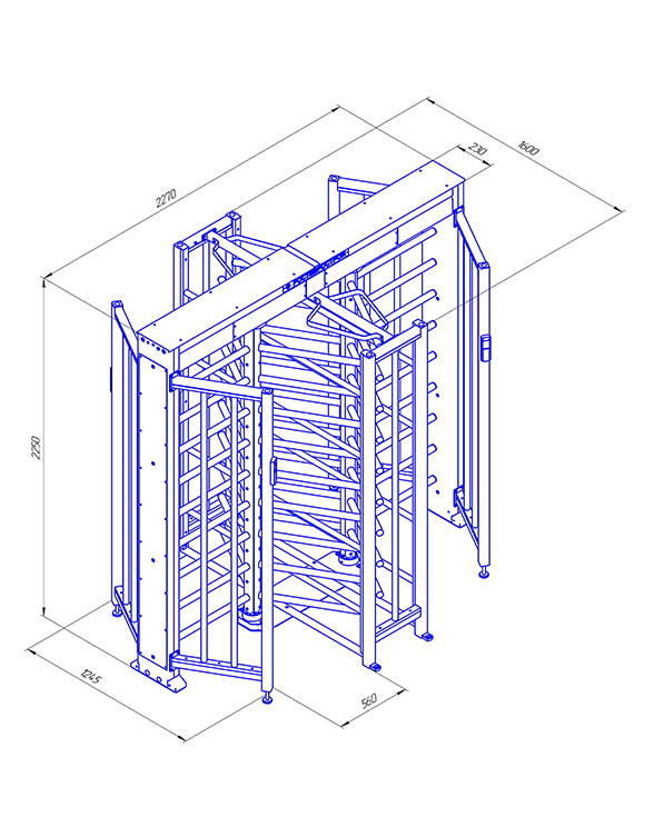 Турникет полноростовый. Полноростовой роторный двух проходной 3-х лопастной турникет с ограждением из нержавеющих труб. Ширина прохода 560 мм. Пропускная способность на два прохода при свободном проходе 80 чел./мин. УХЛ 4.2. 12±2 B DC; 89 Вт; +1°C...+50°C; 2270х1600х2250 мм; 365 кг