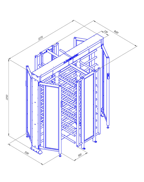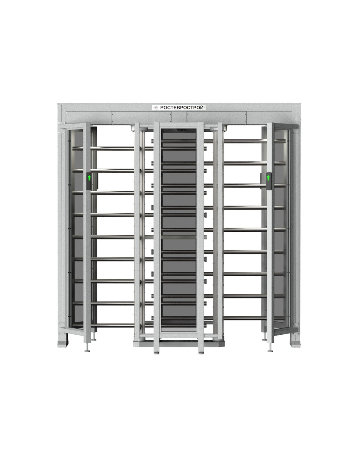 Турникет полноростовый. Полноростовой роторный двух проходной 4-х лопастной турникет с ограждением из стекла. Ширина прохода 500 мм. Пропускная способность на два прохода при свободном проходе 80 чел./мин. УХЛ 4.2. 12±2 B DC; 89 Вт; +1°C...+50°C; 2270х1600х2250 мм; 400 кг