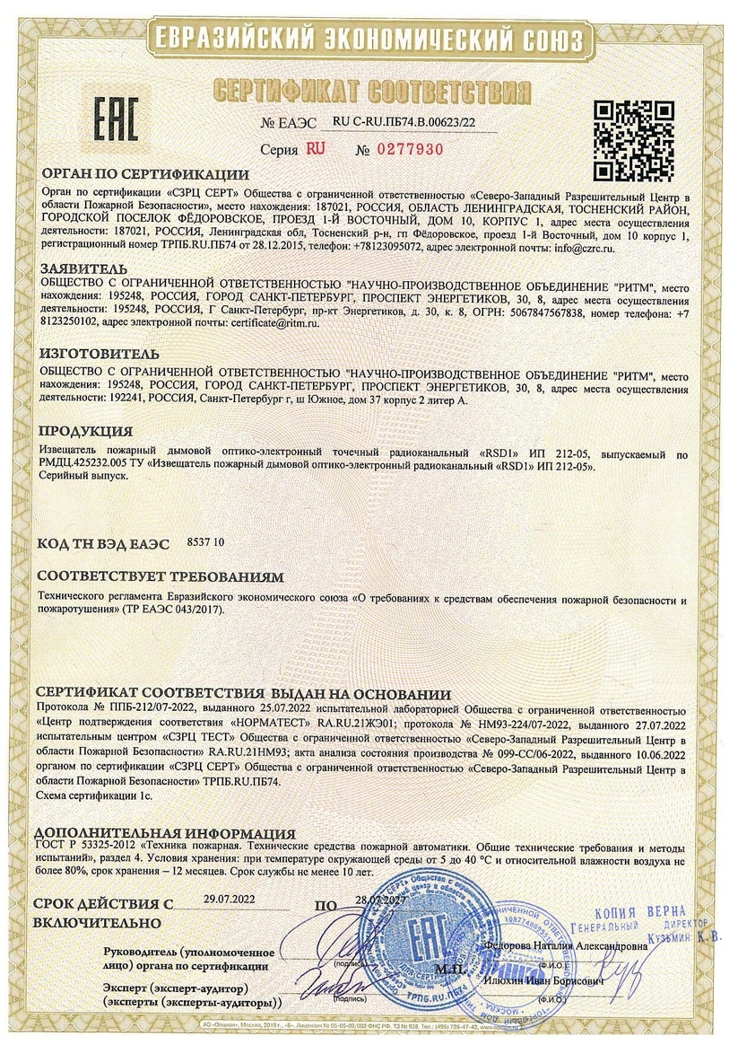 Извещатель пожарный дымовой оптико-электронный радиоканальный ИП-212-05. Извещатель пожарный дымовой оптико-электронный радиоканальный для работы в составе радиосистемы РИТМ, f-раб.433,075...434,775 МГц, элемент питания 1 x Li батарея 3 В (тип CR123A) в комплекте; t-раб.-30...+55 °С, габ.размеры Ø94х41 мм