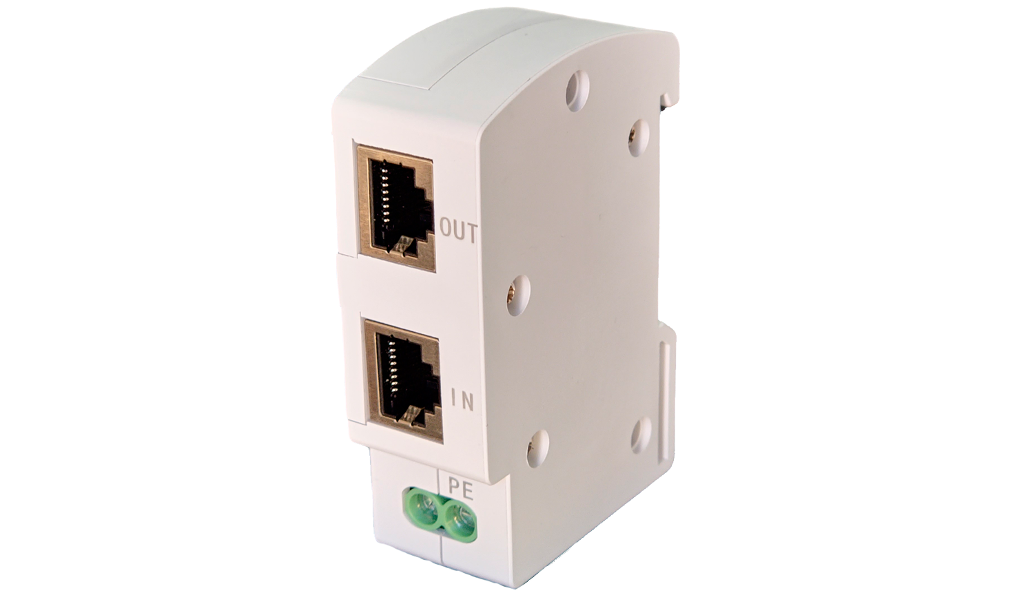 Устройство грозозащиты цепей Ethernet. Устройство грозозащиты линий Ethernet, на 1 порт, ток разряда 2.5 кА ном/5кА макс(8/20 мкс), защищаемые контакты: 1/2/3/6; 4/5/7/8, вход/выход: RJ45 1х10/100/1000Мб/с; монтаж на DIN-рейку; рабочее напряжение в линии данных 6/12В ном, 20В макс, -40...+70°C, 25х51х78 мм.