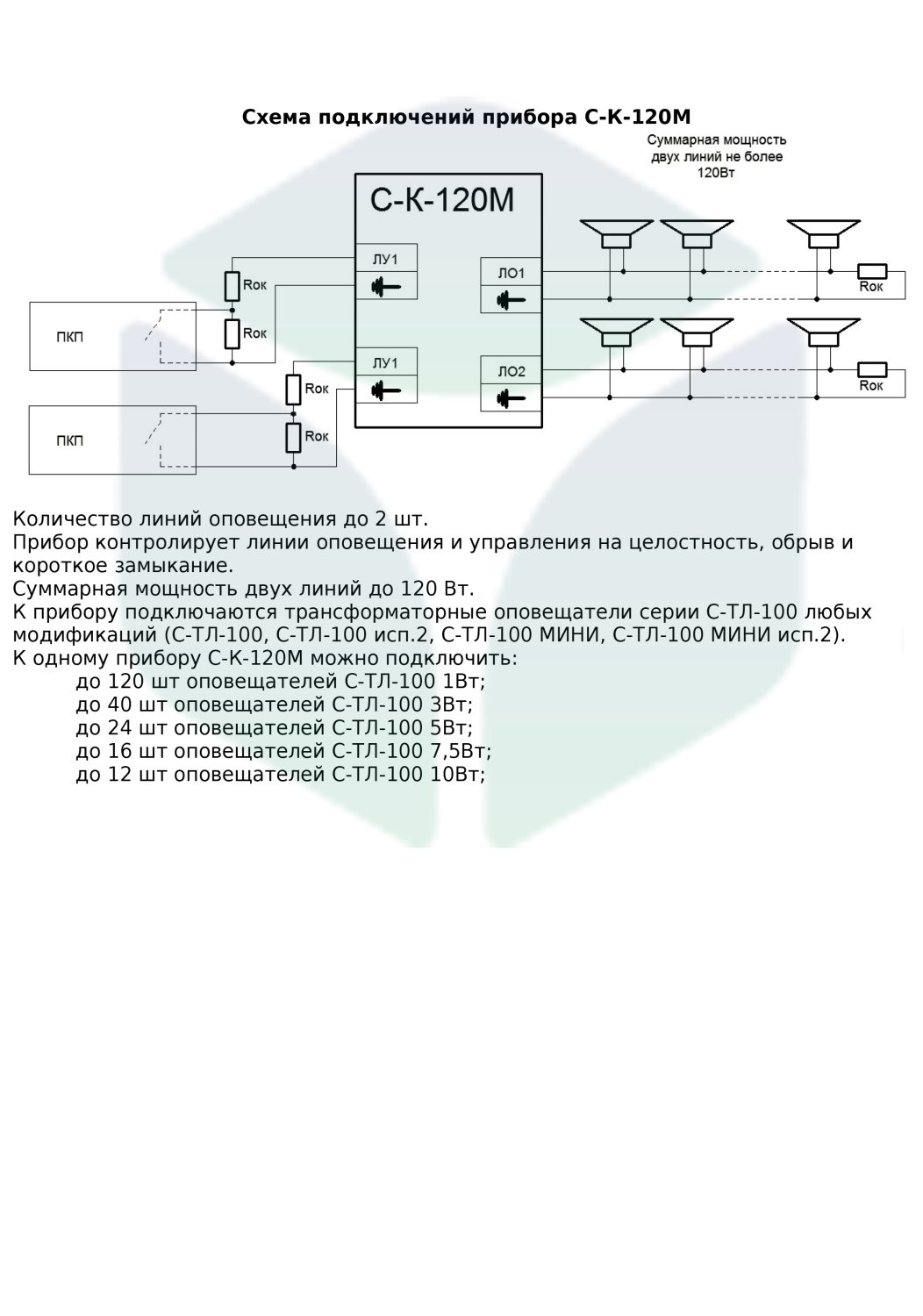К прибору подключаются трансформаторные оповещатели серии С-ТЛ-100-х любых модификаций(С-ТЛ-100, С-ТЛ-100 исп.2, С-ТЛ-100 исп.2, С-ТЛ-100 МИНИ, С-ТЛ-100 МИНИ исп.2)В памяти прибора размещены три сообщения с возможностью перезаписи через внешний микрофон или линейный вход: Тестовое сообщение : «Тестирование системы оповещения. Testing the system of notification».1: «Внимание! Пожарная тревога! Срочно всем покинуть помещение! Attention! Fire alarm! Please leave the compartment! ».2: «Внимание! Уважаемые сотрудники! Администрация сообщает, что в здании произошёл пожар. Просим вас сохранять спокойствие и действовать согласно плану эвакуации».