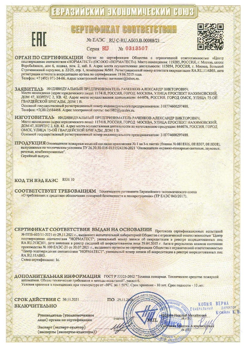 Оповещатель охранно-пожарный звуковой. Радиоканальный звуковой оповещатель, уровень звукового давления на расстоянии 1 м 105дБ, частота звучания 4000Гц, элементы питания - 2/3 В ( CR123A), IP41,160х103х47 мм, 0,3 кг, без элементов питания.