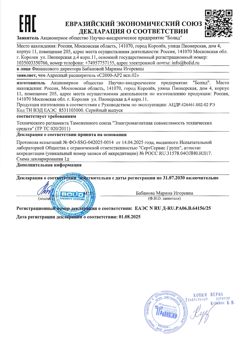 Адресный расширитель «С2000-АР2 исп. 02» применяется с контроллером двухпроводной линии связи «С2000-КДЛ» или «С2000-КДЛ-2И» в составе интегрированной системы охраны «Орион».Предназначен для подключения неадресных пожарных, охранных или пожарно-охранных извещателей с тревожными выходами типа «сухой контакт» в двухпроводную линию связи КДЛ. Электропитание и информационный обмен АР2 осуществляется по ДПЛС КДЛ. АР2 поддерживает протокол двухпроводной линии связи ДПЛС_v2.xx и позволяет получать значение напряжения ДПЛС в месте своего подключения, оснащён датчиком вскрытия корпуса. АР2 рассчитан на непрерывную круглосуточную работу.