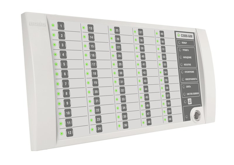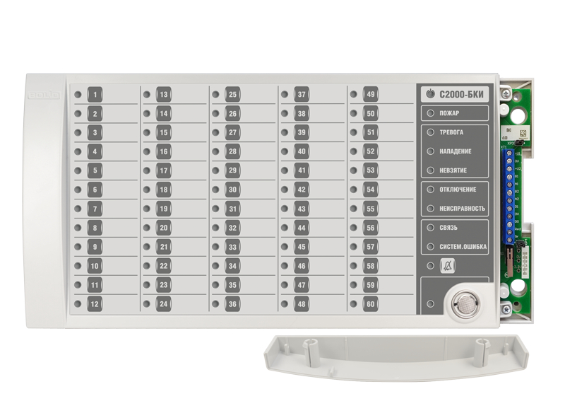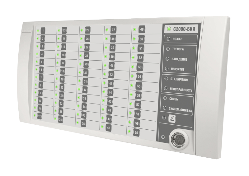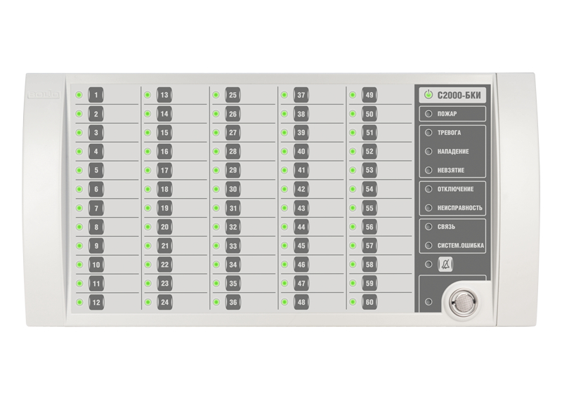 Блок контроля и индикации. Блок индикации и управления для работы в составе ИСО "Орион", 60 индикаторов состояния разделов, 6 одноцветных индикаторов тревог и неисправностей, 1 индикатор состояния блока, 1 индикатор состояния связи блока с сетевым контролером, 1 индикатор наличия системной ошибки блока, 1 индикатор отключения звука, 1 индикатор состояния доступа к управлению разделами; две линии RS-485, встроенный считыватель TouchMemory, U-пит.10.2...28.4 В, I-потр.200 мА (max), IP20, t-раб.-30...+50°С, 340х170х27 мм