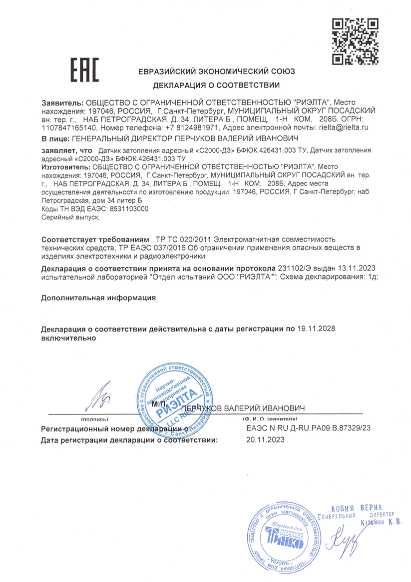 Датчик затопления адресный "С2000-ДЗ" предназначен для обнаружения утечек воды из водопроводов и формирования адресного извещения о тревоге по двухпроводной линии связи (ДПЛС).