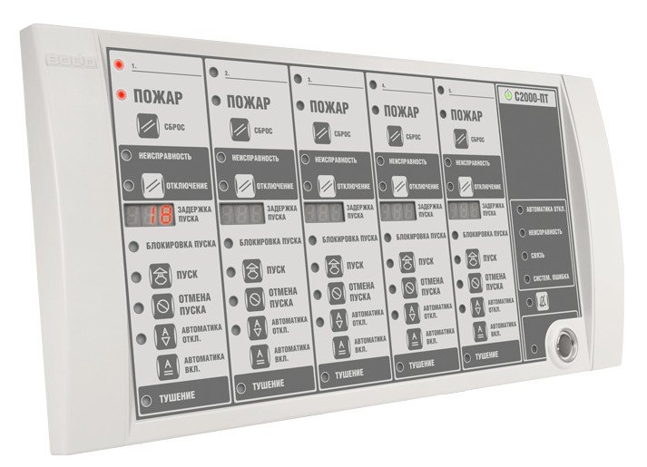 Блок индикации и управления. Блок индикации системы пожаротушения для работы в системе ИСО "Орион", 45 индикаторов состояния 5 направлений пожаротушения, 5 семисегментных индикатора задержки пуска, две линии RS-485, встроенный считыватель TouchMemory; U-пит. 10.2...28.4 В, два входа питания; IP20, t-раб.-30...+50°С, 340×170×27 мм