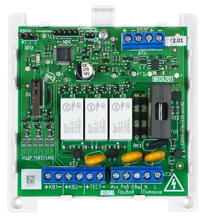 Блок сигнально-пусковой адресный. Блок сигнально-пусковой с встроенным изолятором короткого замыкания ДПЛС для управления приводами малой мощности; 2 релейных вых.с контрол., U-коммут.250 В, I-коммут.500 мА; 2 контролируемых концевых выключателя; U-пит.8…12 В (по ДПЛС), I-потр.1.5 мА; IP40, t-раб.-30…+55°C, 106х109х42 мм
