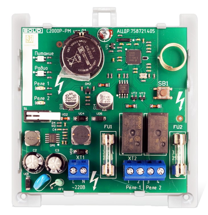 Модуль релейный радиоканальный. Релейный радиоканальный модуль для работы с С2000-АРР125, два релейных выхода, U-коммут.250 В, I-коммут.3 А, U-пит.90...264 В, резервный источник питания 3 В CR2032, P-потр.1 ВА, IP20, t-раб.-30...+50°C, 102х107х39 мм