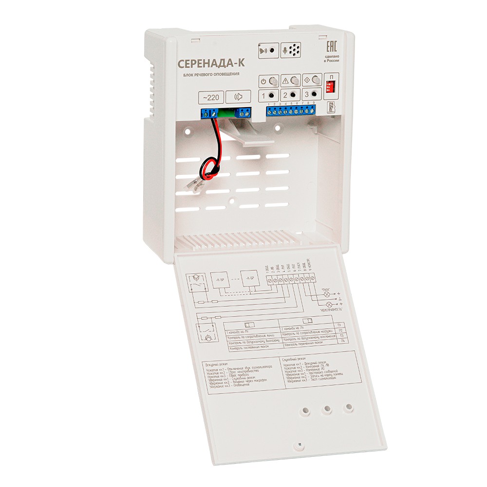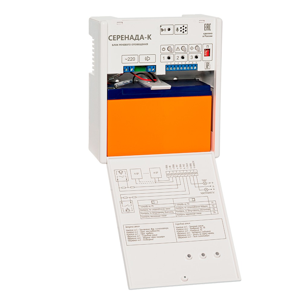 Блок речевого оповещения. Блок речевого оповещения, 30 Вт, 1 зона, 2 Ом, 2 линии, 4 сообщения, 200...5000 Гц ; Встроенный микрофон; Возможность подключения: До 10-ти блоков расширения Серенада-К-БР. Автоматический контроль целостности линий оповещения. Продолжительность речевых сообщений 16 сек, АКБ 12В, А·ч (в комплект не входит), 187...242В, 0...40°C, 200х180х80 мм.