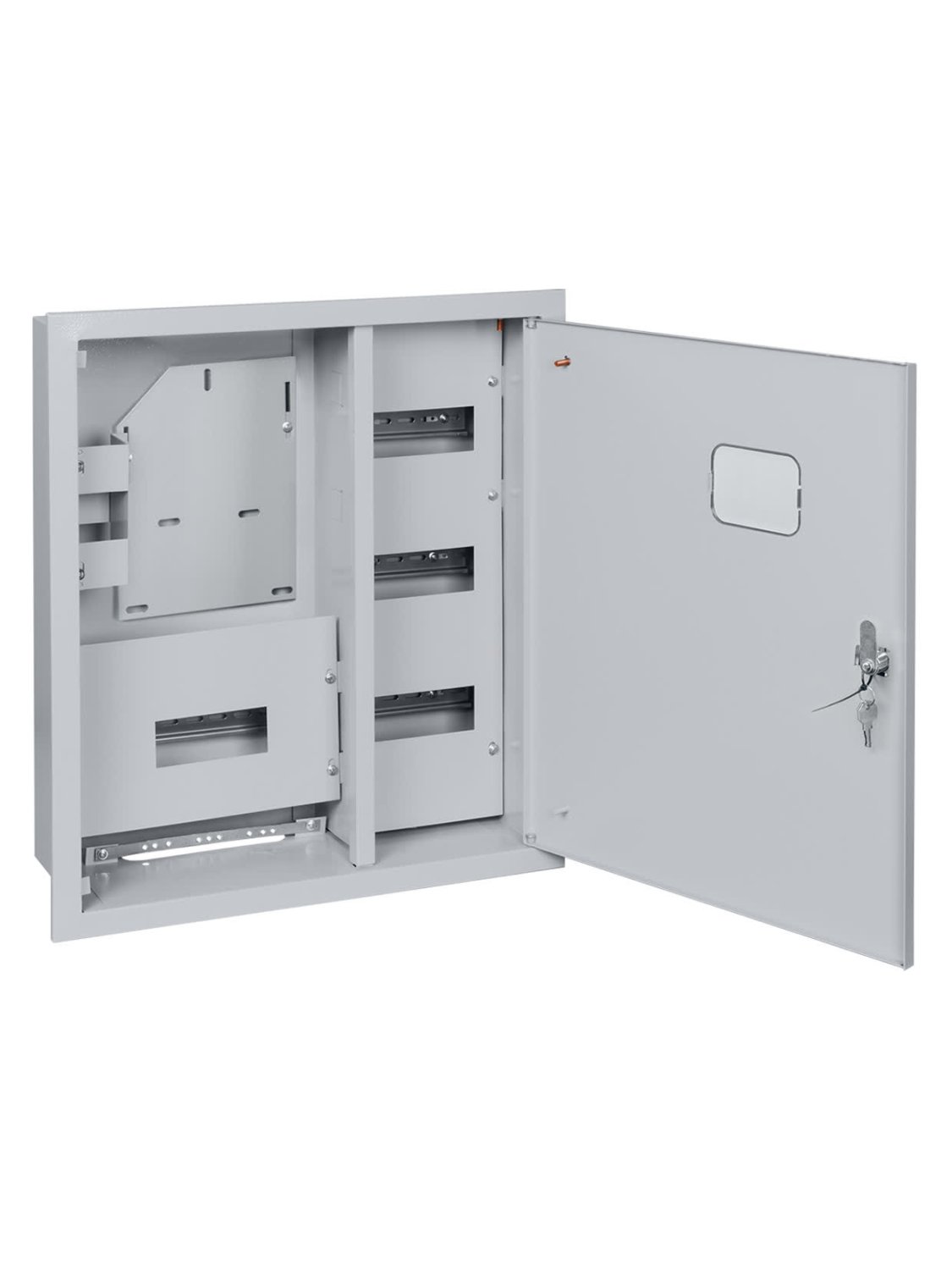 Щит учётно-распределительный. Щит учётно-распределительный врезной, 4 DIN-рейки на 24 модуля, монтажная панель для установки счётчика, дверца с смотровым окошком, IP31, габ.размеры 580х500х165 мм, цвет серый