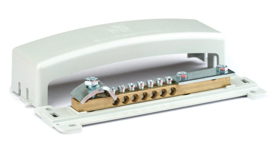Шины уравнивания потенциалов предназначены для присоединения всех металлических не токоведущих частей конструкции к системе уравнивания потенциалов. Шина уравнивания потенциалов выполнена из латуни и имеет пластиковый кожух. Устанавливается в местах, доступных квалифицированному электротехническому персоналу. Имеется возможность подключить: - плоский проводник сечением до 30х4 мм – 1 подключение; - круглый проводник диаметром до 8 мм – 1 подключение; - круглый проводник сечением 4–25 мм2 – до 10 подключений.