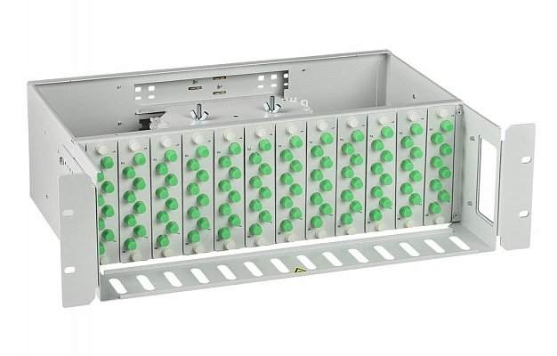 Кросс оптический 19". Оптический кросс 19", 3U, 96 FC APC портов SM, съемный передний органайзер, стальной, серый, укомплектованный(кассеты/планки/комплект монтажа/розетки/пигтейлы/КДЗС), 410х210х131 мм.