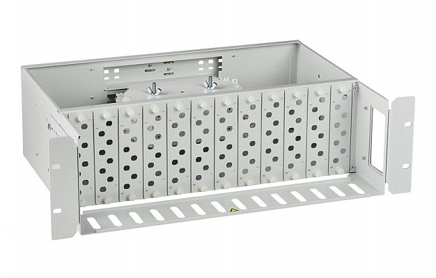 Кросс оптический 19". Оптический кросс 19", 3U, до 96 FC/ST портов, съемный передний органайзер, стальной, серый, укомплектованный(касеты/планки/комплект монтажа), 410х210х131 мм.