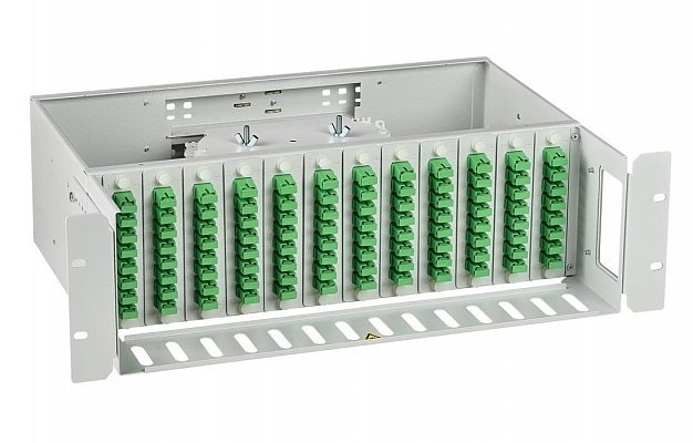 Кросс оптический 19". Оптический кросс 19", 3U, 96 SC APC портов SM, съемный передний органайзер, стальной, серый, укомплектованный(кассеты/планки/комплект монтажа/розетки/пигтейлы/КДЗС), 410х210х131 мм.