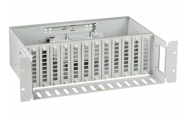 Кросс оптический 19". Оптический кросс 19", 3U, до 96 SС портов, съемный передний органайзер, стальной, серый, укомплектованный(касеты/планки/комплект монтажа), 410х210х131 мм.