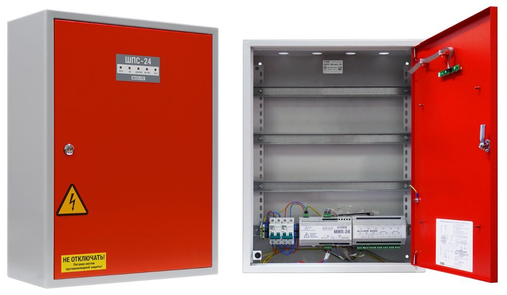 Шкаф пожарной сигнализации. Шкаф для монтажа средств пожарной автоматики с креплением на DIN-рейку; 2 ввода питания; U-вх.150…253 В, U-вых.27.2±6 В, I-ном.2 А, I-макс.2.2 А, под два АКБ 12 В 17 А·ч; встроенный блок коммутации БК-24-RS485 (две изолированные линии интерфейса RS-485 для подключения к компонентам ППКП и ППКУП расположенным за пределами ШПС, одна линия RS-485 для подключения компонентов ППКП внутри ШПС; 7 выходов для подключения к приборам внутреннего интерфейса RS-485; 7 выходных каналов 24 В с индивидуальной защитой); IP41, t-раб.-10…+40°С, 650х500х220 мм. Красного цвета. Возможность установки монтажного комплекта МК-1.